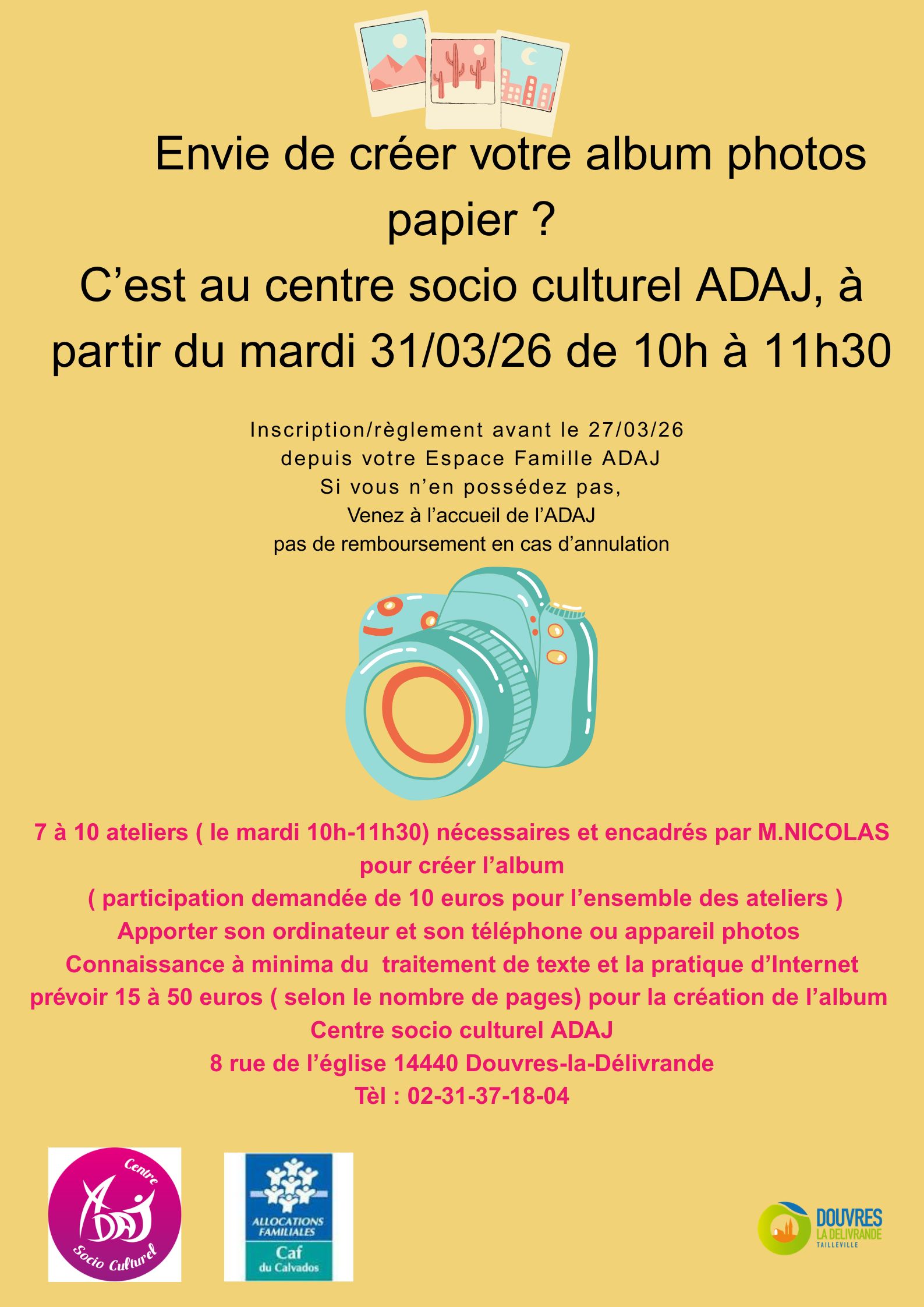 Le mardi 31 mars Créer votre album photos personnalisé Tarif de 10€ puis prévoir 10 à 50€ en supplément en fonction du nombre de pages.