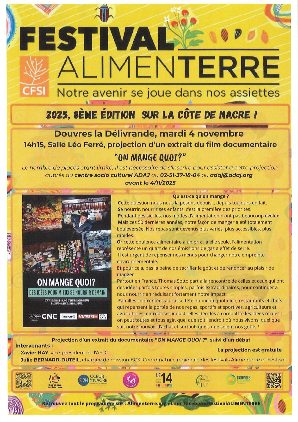 Le mardi 4 novembre Festival AlimenTerre 2025 Projection d'un extrait du film documentaire "On mange quoi ?" suivie d'un débat. Sur inscription.