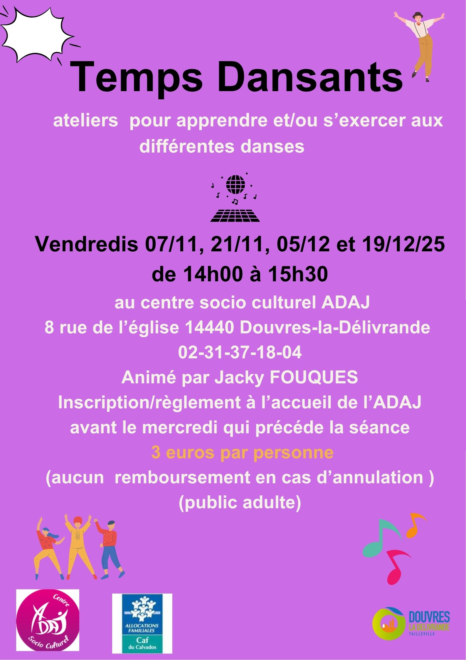 Le vendredi 7 novembre Temps Dansants Pour adultes – 3€ la séance. Réservation et règlement à l’accueil du centre socioculturel ADAJ. Pas de remboursement en cas d’annulation de votre part.